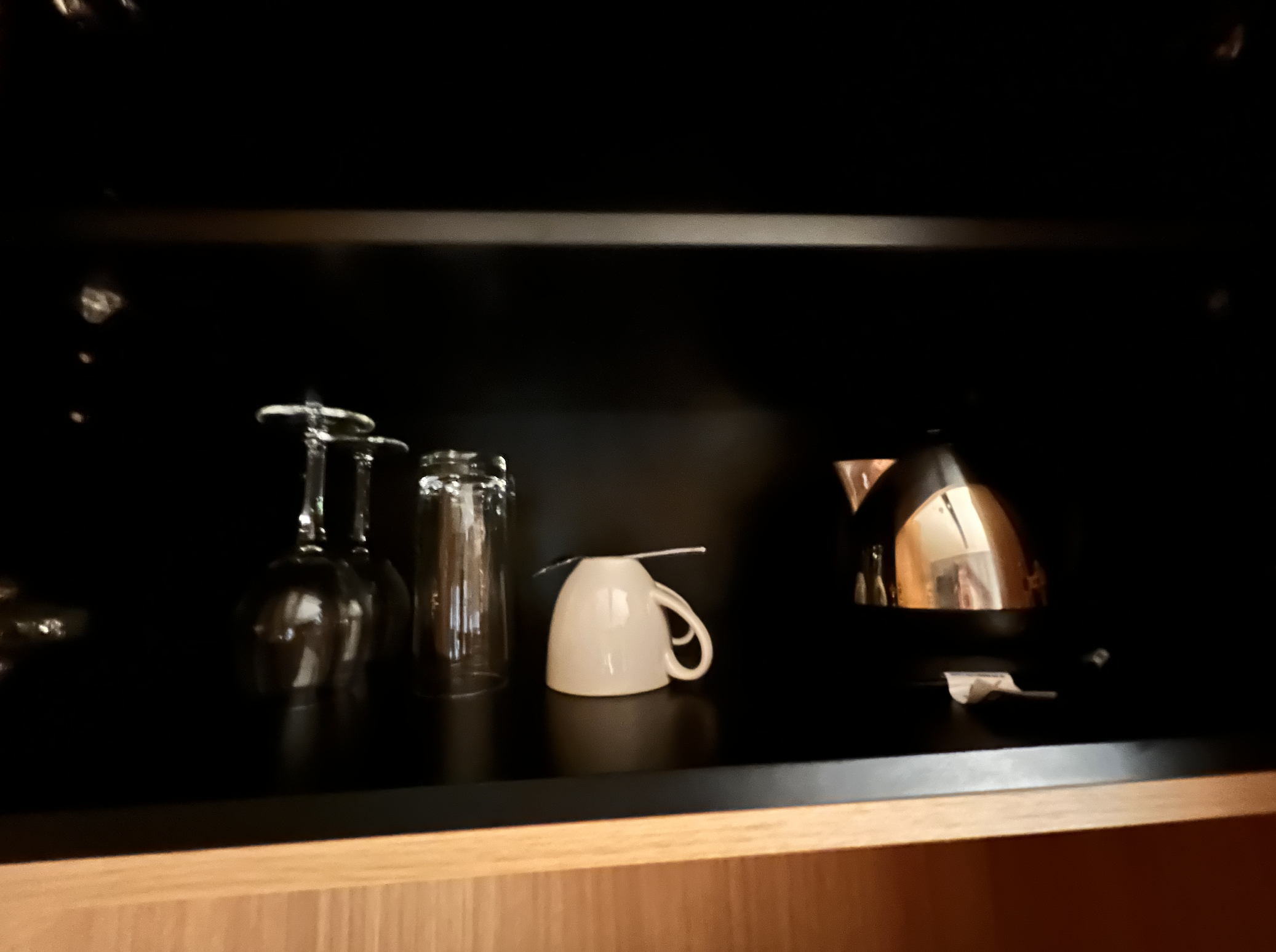 I also expect a small, branded writing pad and pen in a hotel. They used to be here. No longer. Another cost-cutting measure. And no water bottle. Not even one. How hard is that? Oh, there is an entire shelf of “snacks” and a mini-bar full of ordinary beverages, all for extra dollars, of course, glaring at you to spend. In the cupboard above the few “complimentary” cheap tea bags and sugars, were just two tall glasses, two very small wine glasses, and a single cup with no saucer, and a single tea spoon.