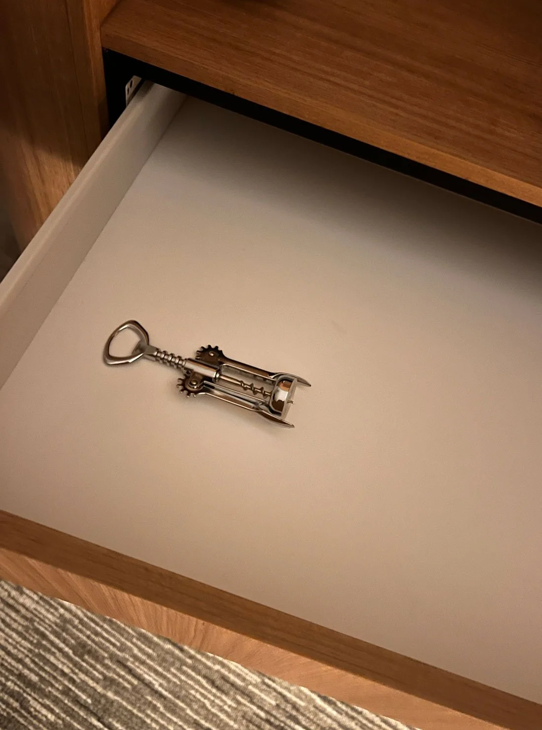 There are quite a few drawers in the rooms. Almost all are empty. Upon inspection, there was one sad corkscrew sitting all alone.